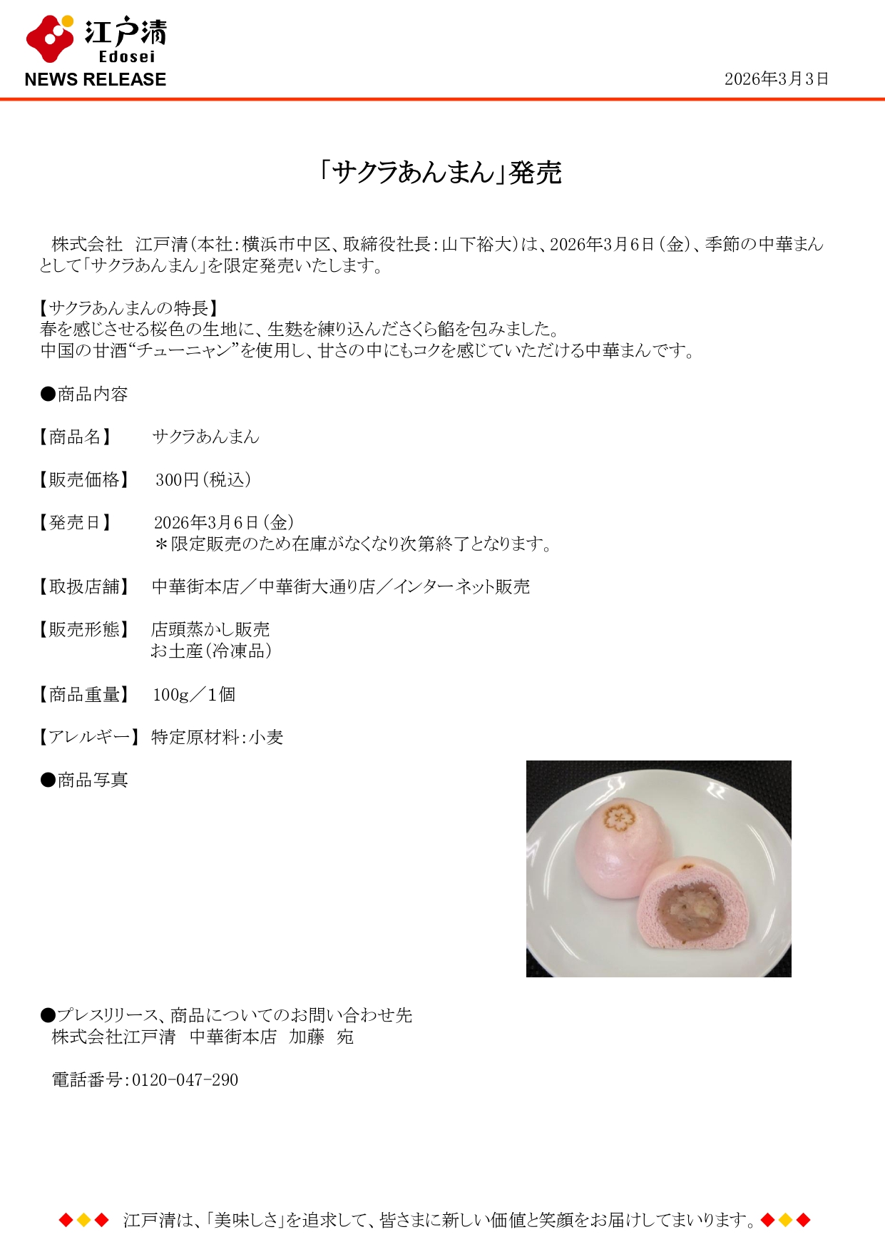 株式会社 江戸清(本社:横浜市中区、取締役社長:山下裕大)は、2026年3月6日(金)、季節の中華まんとして「サクラあんまん」を限定発売いたします。