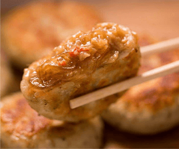フカヒレをはじめ、カニやタケノコ、鶏肉を合わせて中国醤油で絶妙に味付けをした餡を山芋や葱を練り込んだもちもちの生地に詰め込みました。焼餅(シャオピン)を割って溢れ出るトロトロの餡はフカヒレスープのようで食欲をそそります。